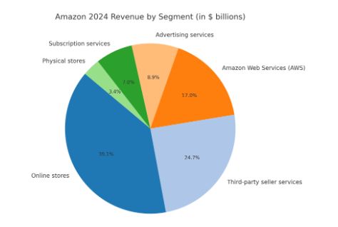 ● Online stores ($247.0 billion): This is Amazon's largest revenue stream, accounting for nearly 39% of total revenue. It includes sales of products sold directly by Amazon on its platform.